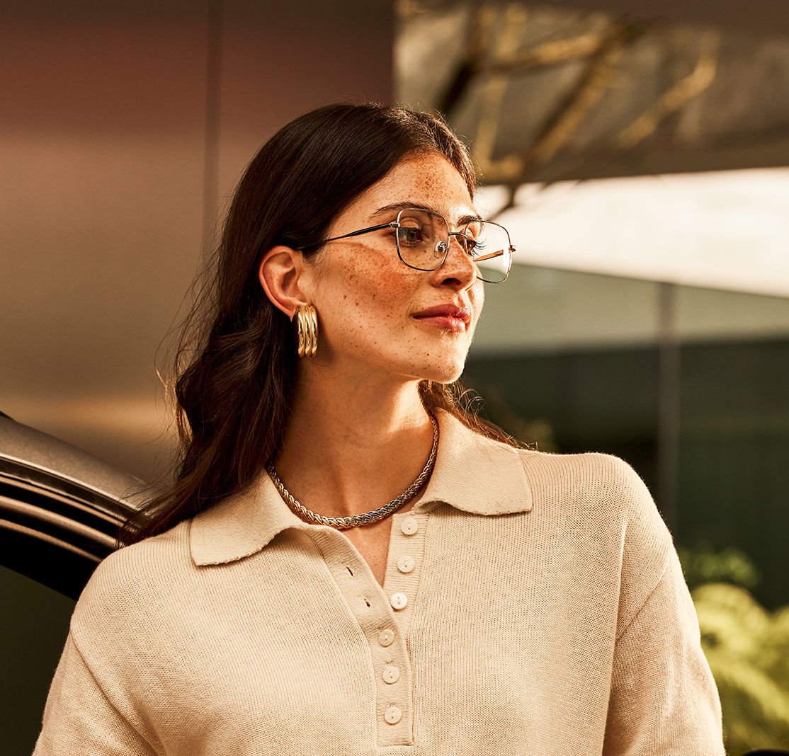 Stylingtip: combineer minimalistische metalen monturen in goud, zilver of rosé met een strakke, monochrome outfit. Zo wordt je bril een subtiel en tegelijk krachtig statement.