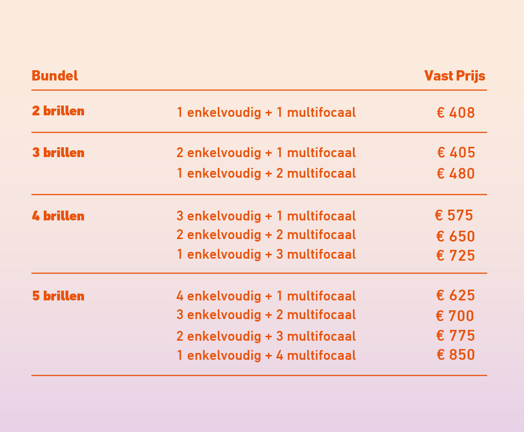Bij ons koop je al een enkelvoudige bril vanaf € 129, en een multifocale bril vanaf € 279. Neem je een bundel met meerdere enkelvoudige of multifocale brillen? Dan betaal je per bril nog minder!